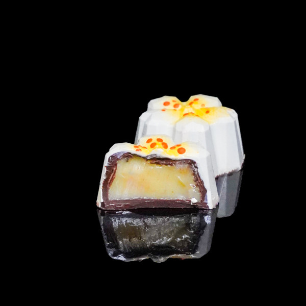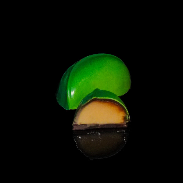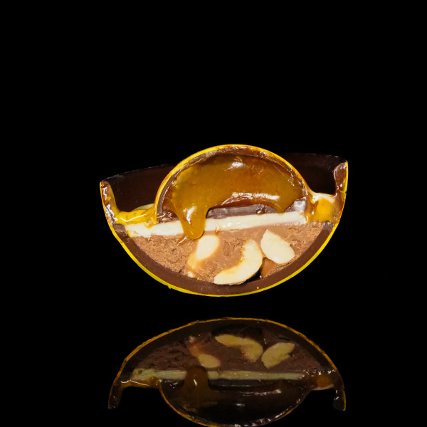 Yellow egg. The base of the chocolate egg is filled with velvety-soft gianduja cream that enchants with its nutty smoothness. In the center of the egg is an orange caramel sphere made of ginger, lime, and mint: fresh, spicy, with a subtle heat. The dark chocolate shell completes the flavor composition with a noble bitterness.