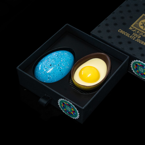 An irresistibly charming Easter set with a surprise. Two hand-painted chocolate eggs filled with extraordinary layers.