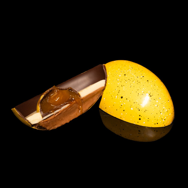 A chocolate half of an Easter egg filled with silky gianduja cream. At its heart — a vibrant bonbon with caramel made from sweet mango and juicy passion fruit. The dark Selection chocolate shell completes the composition, adding depth and refinement.