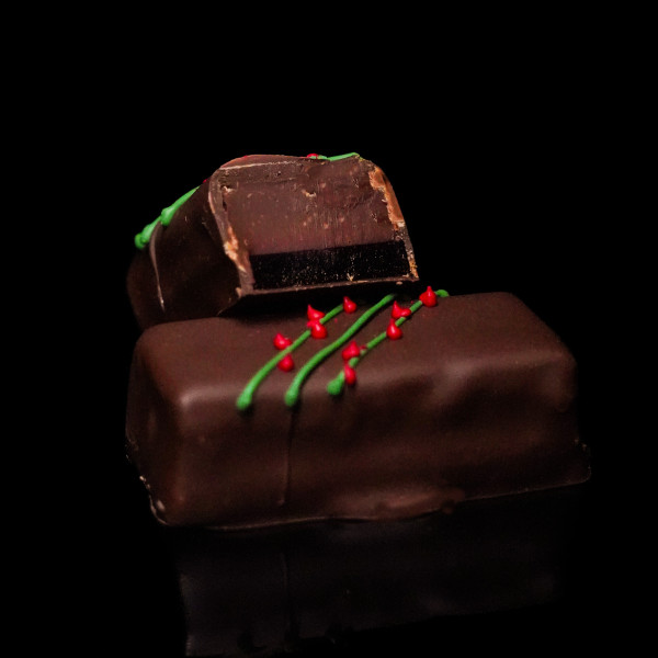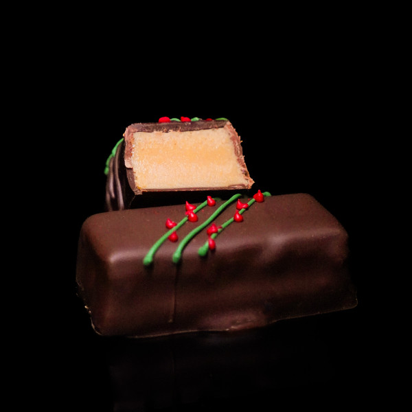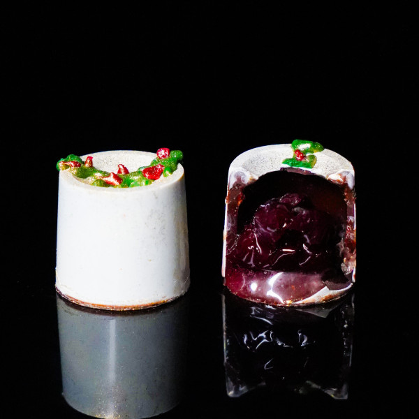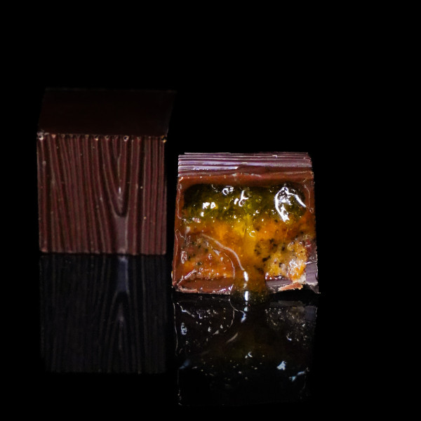 A bright green candy with an experimental winter soul: a light marmalade made from generous beets with a touch of horseradish - bold, festive, lively. Underneath it is a crispy pillow of praline and rye bread, reminiscent of one's home and the table at which one gathers on Christmas Eve.