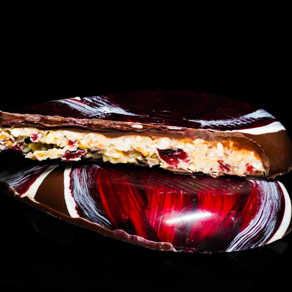 Crunchy green buckwheat popcorn adds an unexpected texture, white chocolate wraps with softness, cranberry brings a bright acidity, and crushed hazelnuts leave a warm, nutty finish.