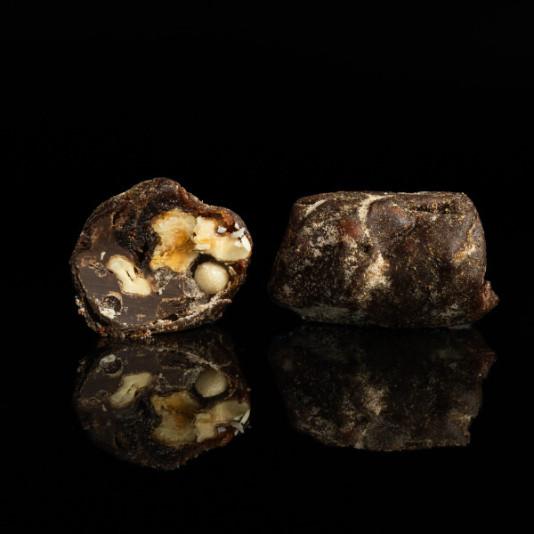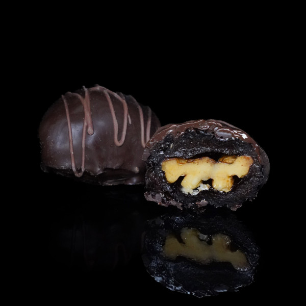 Ripeness — in selected prunes with caramelised walnut in dark chocolate.