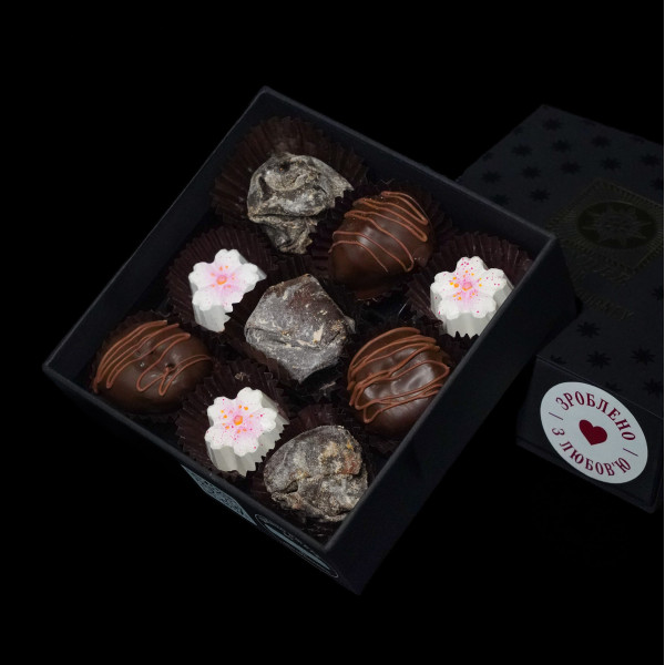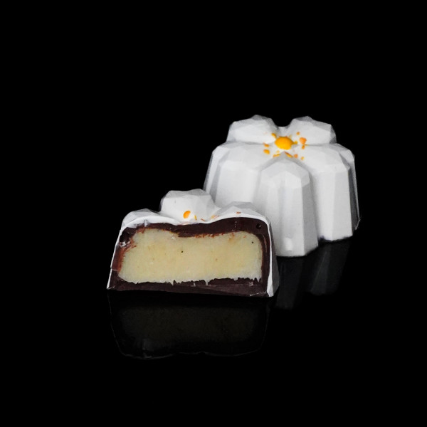 Blossom — in dark chocolate with white chocolate ganache infused with tonka beans.