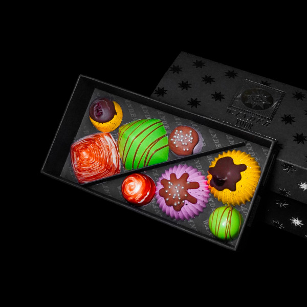 A combination of delicate, creamy, and crunchy textures. Inside — bright confit or rich caramel, airy marshmallow, and silky milk chocolate ganache with expressive crunchy accents. The shell of milk and dark chocolate creates a harmonious taste and highlights the character of the collection.