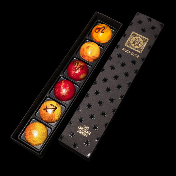 Dark chocolate ganache with jalapeño pepper — bold and expressive. A wave of heat gradually unfolds, revealing the depth of dark chocolate and a long, warm finish. An intense character without half-tones.