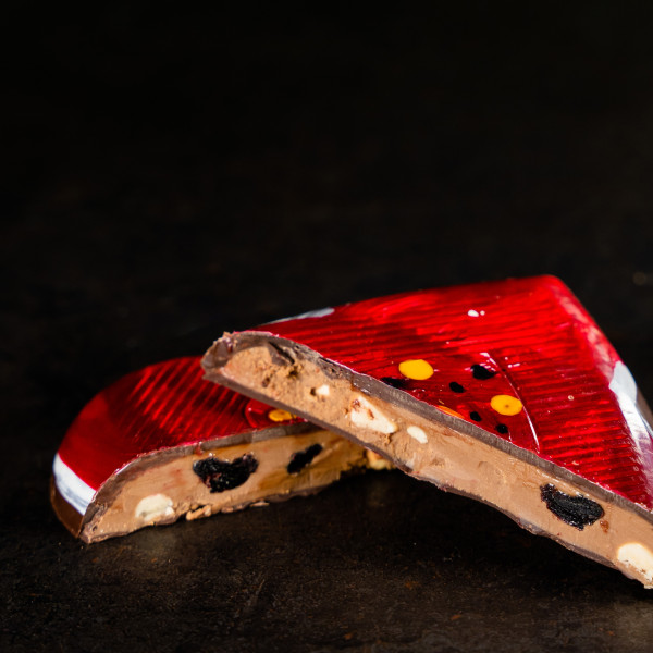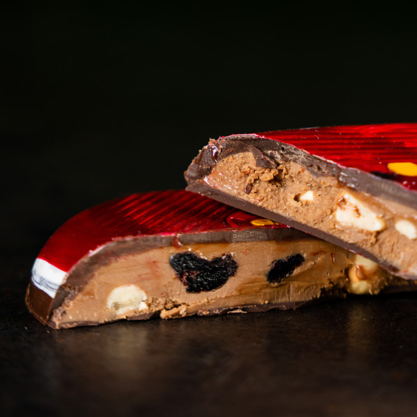 Aromatyczna suszona wiśnia ze swoim delikatnym, bogatym smakiem doskonale łączy się z chrupiącym wybornym orzeszkiem laskowym. Ta para niesamowicie smakuje w nadzieniu z orzechowego kremu dżandui na mlecznej czekoladzie. Czarny jak noc korpus czekolady podkreśla wszystkie smakowe niuanse prawdziwym królewskim akcentem.