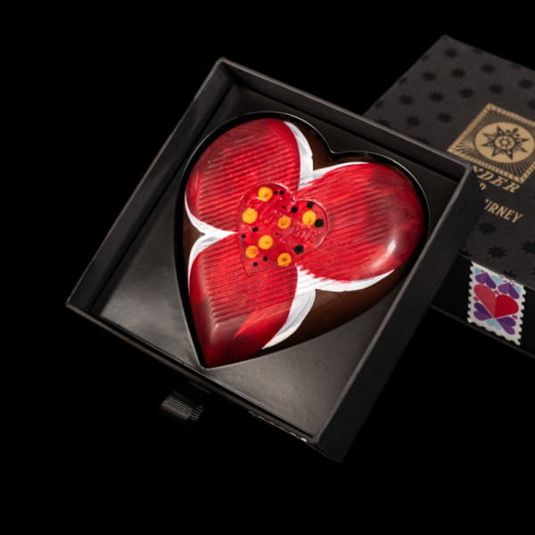Najdelikatniejsza, najluksusowsza, najpiękniejsza – ta duża czekoladka w kształcie serca z jaskrawym fantazyjnym dekorem to prawdziwa królowa zakochanych łasuchów.