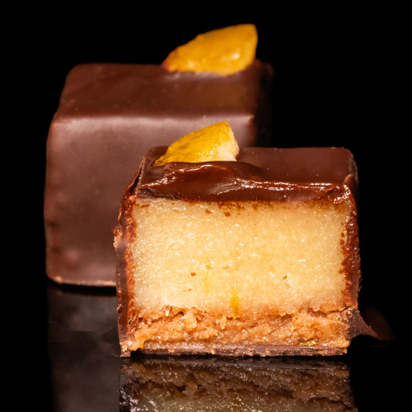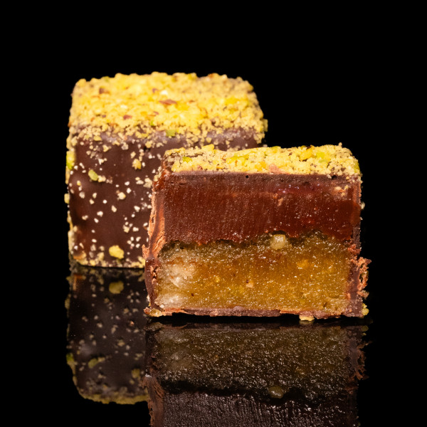 Wyjątkowy dwuwarstwowy cukierek dla koneserów mocnych emocji. Gęsty, jedwabisty ganache z bardzo ciemnej czekolady na pachnącym marcepanie z perskimi pistacjami. Prawdziwa przyjemność!