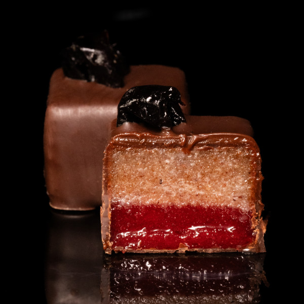 Cukierkowi o jasnym brzmieniu nut soczystej konfitury wiśniowej towarzyszy bogaty marcepan migdałowy ze szczyptą pachnącego, figlarnego cynamonu. Ciemna belgijska czekolada na wierzchu stanowi idealne wykończenie.
