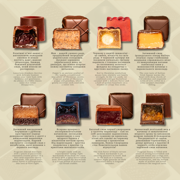 Cytat Zwycięstwa jest symbolem życia, odnowy i niezniszczalności. Wszystkie możliwe tsukerki o ukraińskim charakterze: przysmaki z naszych rodzimych ziół w fantastycznej kolekcji: konfitura z buraków z dodatkiem chrzanu, konfitura z wiśni z makiem, ganache z białymi karpackimi grzybami, miód z chrzanem i skórką pomarańczową.