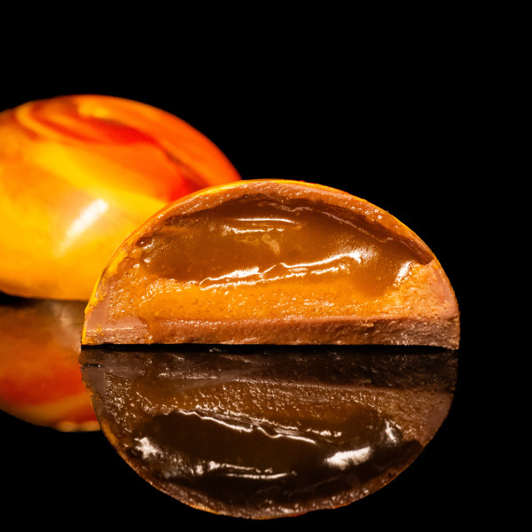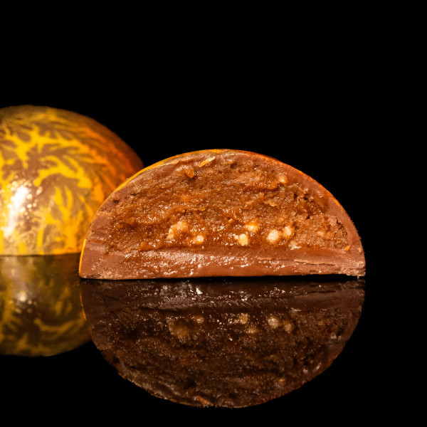 Płynny karmel z mango i marakują, uzupełniony chrupiącą warstwą pralinowego orzecha laskowego — bogate tropikalne brzmienie z elegancką, orzechową głębią. Jasny, wielowarstwowy smak z długą nutą końcową.