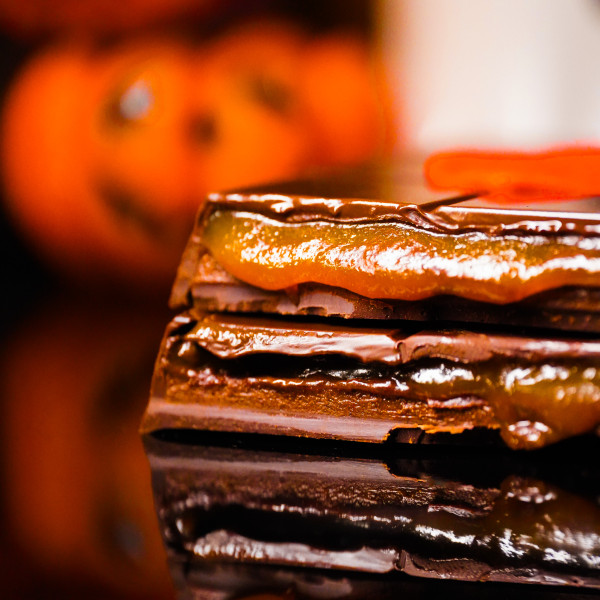 Тепла гарбузова карамель тане повільно, огортаючи пряним шепотом кориці, імбиру, гвоздики й мускатного горіха. Хрусткий шар спекулос додає м’якої вогняності, а темний бельгійський шоколад завершує цю історію — глибоко, затишно, з присмаком вечірнього спокою й легкого чаклунства осені.