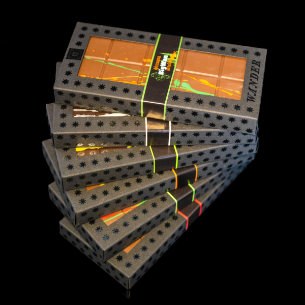 Щедра хвиля духмяної тягучої карамелі з соковитого мандарина та неповторного каламансі на хрусткому шарі з оксамитового фундучного праліне та лимонної цедри. Вишукана ароматна кислинка у обіймах брутального чорного шоколаду - ідеальне поєднання.