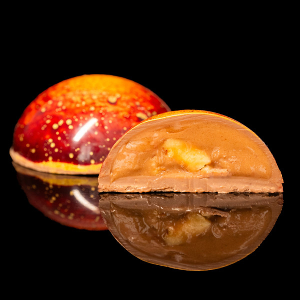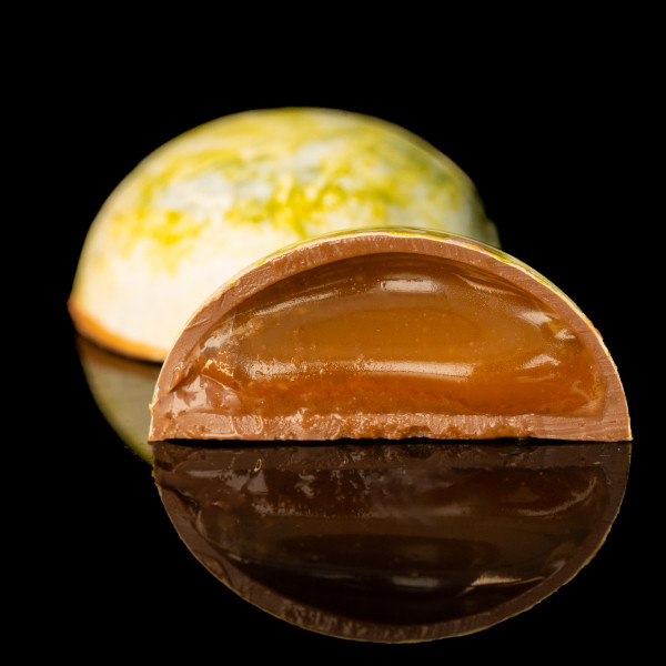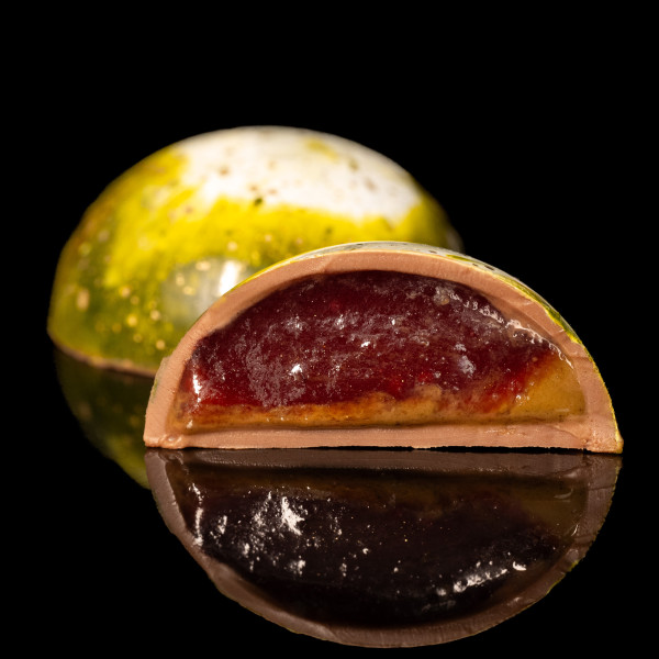 Соковита малинова карамель у поєднанні з делікатним хрустом фісташки. Кремова текстура та глибокий ягідний післясмак.