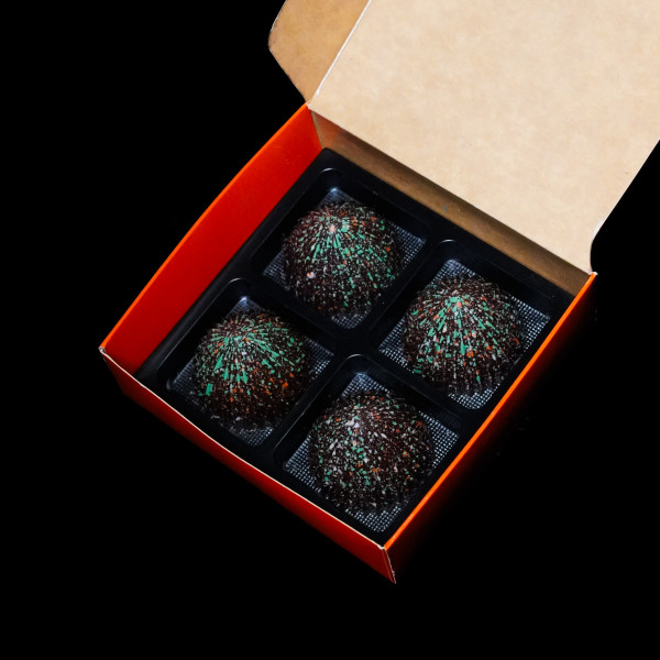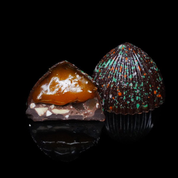 У корпусі з чорного шоколаду — морква в карамелі з манго та цедрою лайма: вона дає природну солодкість, соковитість і теплий овочевий тон, який несподівано точно лягає у фруктову кислотність. Хрусткий шар з мигдалем, гречкою та лимонними цукатами додає ритму й довгого післясмаку.