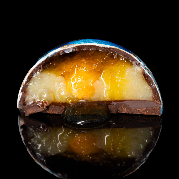 Изысканная конфета с мягким сыром Camembert de Normandie, привезенным из Вены, встречается с карамелизированным фундуком и медово-цитрусовой начинкой. Хрен добавляет острую ноту, а ликер Cointreau – изящную горчинку.