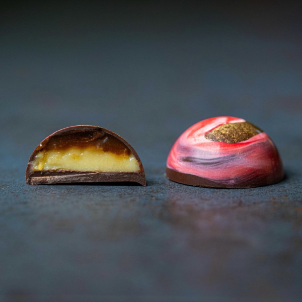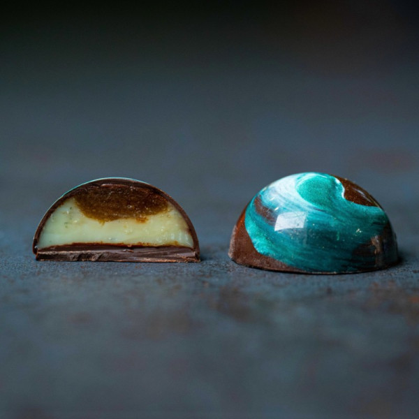 Решительный сыр с благородной голубой плесенью мы добавили в ганаш из белого шоколада и получили сырный вкус на радусов! А вторым слоем в цкерке стал конфи из грушевого пюре и щепотки душистой корицы.