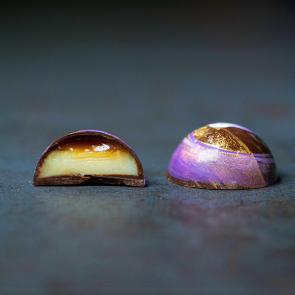 Сир Бимстер - гость королевского двора Нидерландов. Сливочно-ореховый вкус аристократического сыра у ганаши из белого шоколада как нельзя лучше сочетается с уютными нотками кофейной карамели.