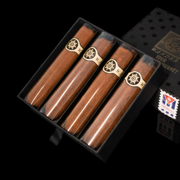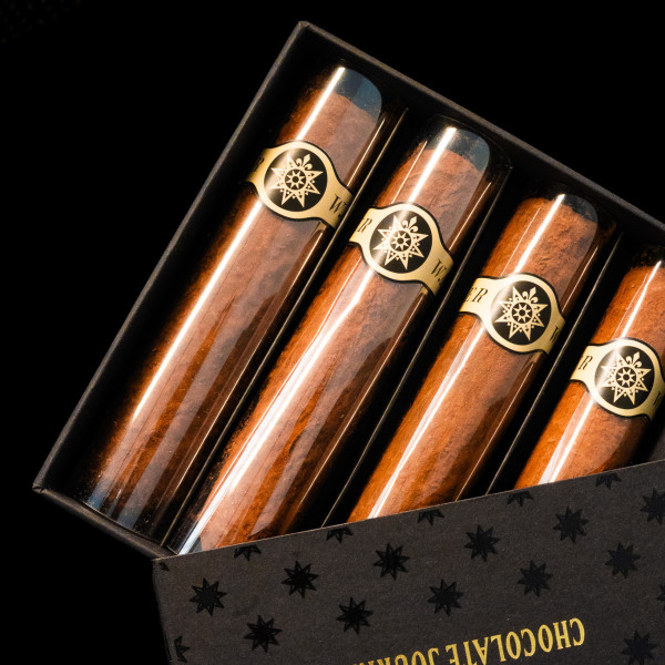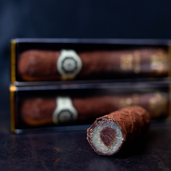 Конфета в форме сигары покрыта черным шоколадом и пыльцой из отборного какао, легкая горчинка которого подчеркивает ее уникальный, вибрирующий вкус.