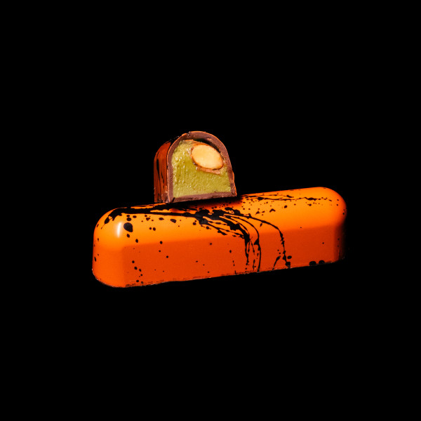 Фисташковое пралине с цельным миндалем под слоем молочного шоколада раскрывает нежные ореховые оттенки с кремовым послевкусием.