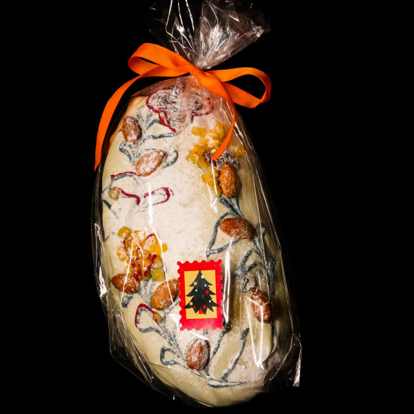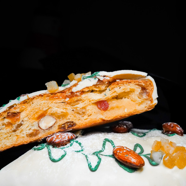 Нежное тесто из пшеничной муки и щедрого сливочного масла медленно созревает, наполняясь теплом. В него мы добавляем насыщенные, сочные цукаты из апельсина, настоянные на Grand Marnier — легендарном цитрусовом ликёре, считавшемся любимым напитком английской королевы. Именно поэтому этот штолен носит королевский характер не только по названию, но и по вкусу: глубокий, благородный, с тонким цитрусовым величием.