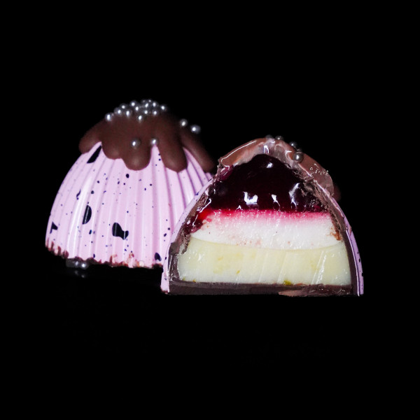 Корпус из чёрного шоколада. Яркий малиновый конфитюр собственного производства, нежный ванильный маршмеллоу, кремовый ганаш из молочного шоколада с кокосовыми нотами малибу.