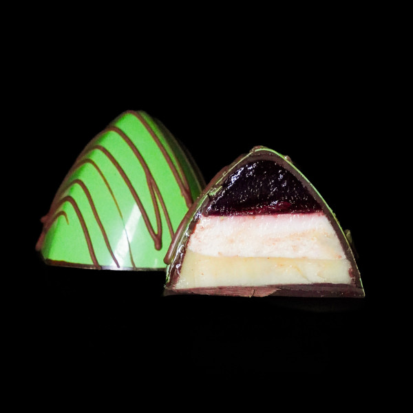 Корпус из чёрного шоколада. Насыщенный смородиновый конфитюр собственного производства, мягкий ванильный маршмеллоу, ароматный ганаш из молочного шоколада с нотами бобов тонка.